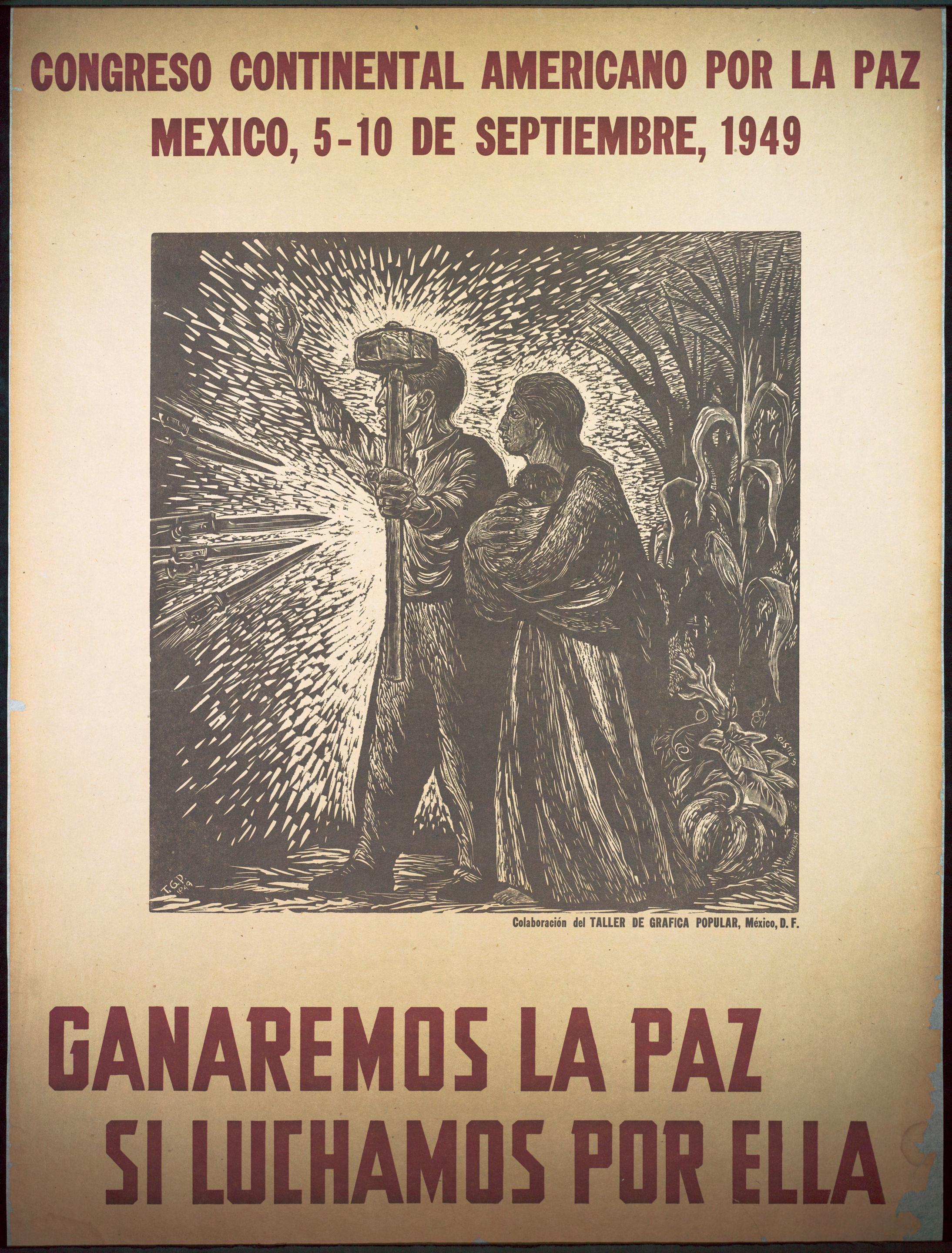 There are several variants of this poster. As Prignitz notes (p. 319), one version is in English ("American Continental Congress for Peace. September 5-10, 1949. Mexico City. We win peace by uniting for it.") and another has alternate text ("El pueblo de México difunde la paz. Sabludo de los artistas del Taller de Gráfica Popular.").